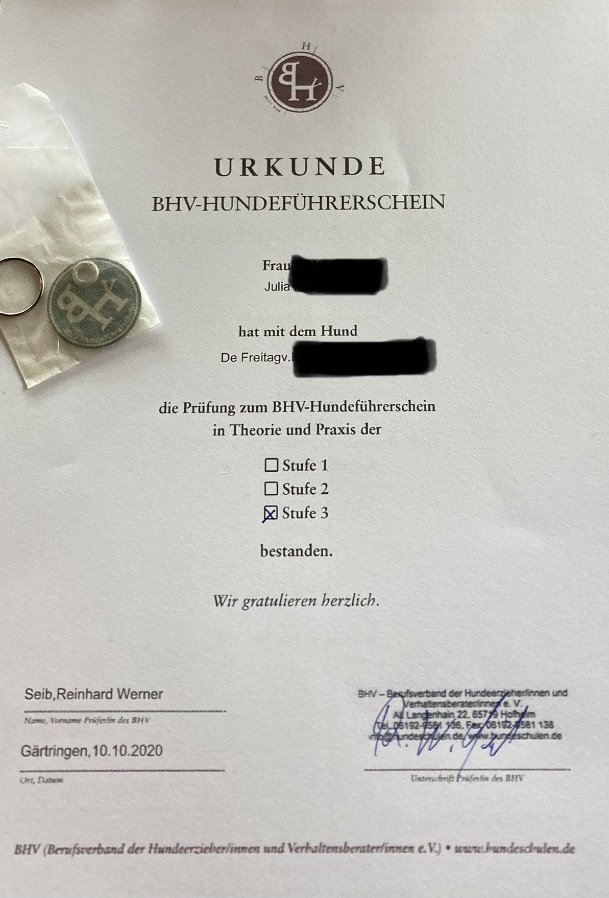 Abgelegte Prüfung: BHV-Hundeführerschein (Stufe 3)